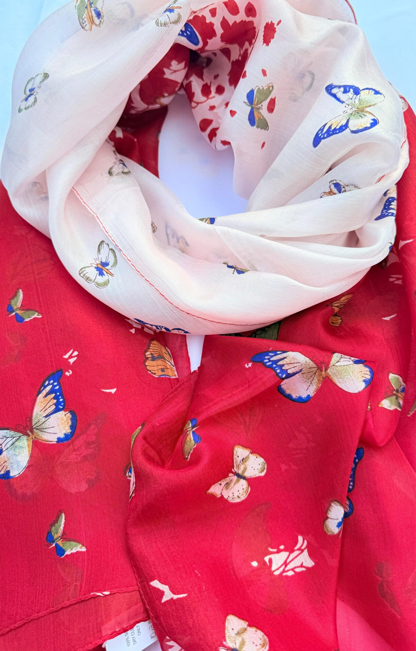 Ivory and cherry red scattered with delicate butterflies—graceful and full of whimsy.