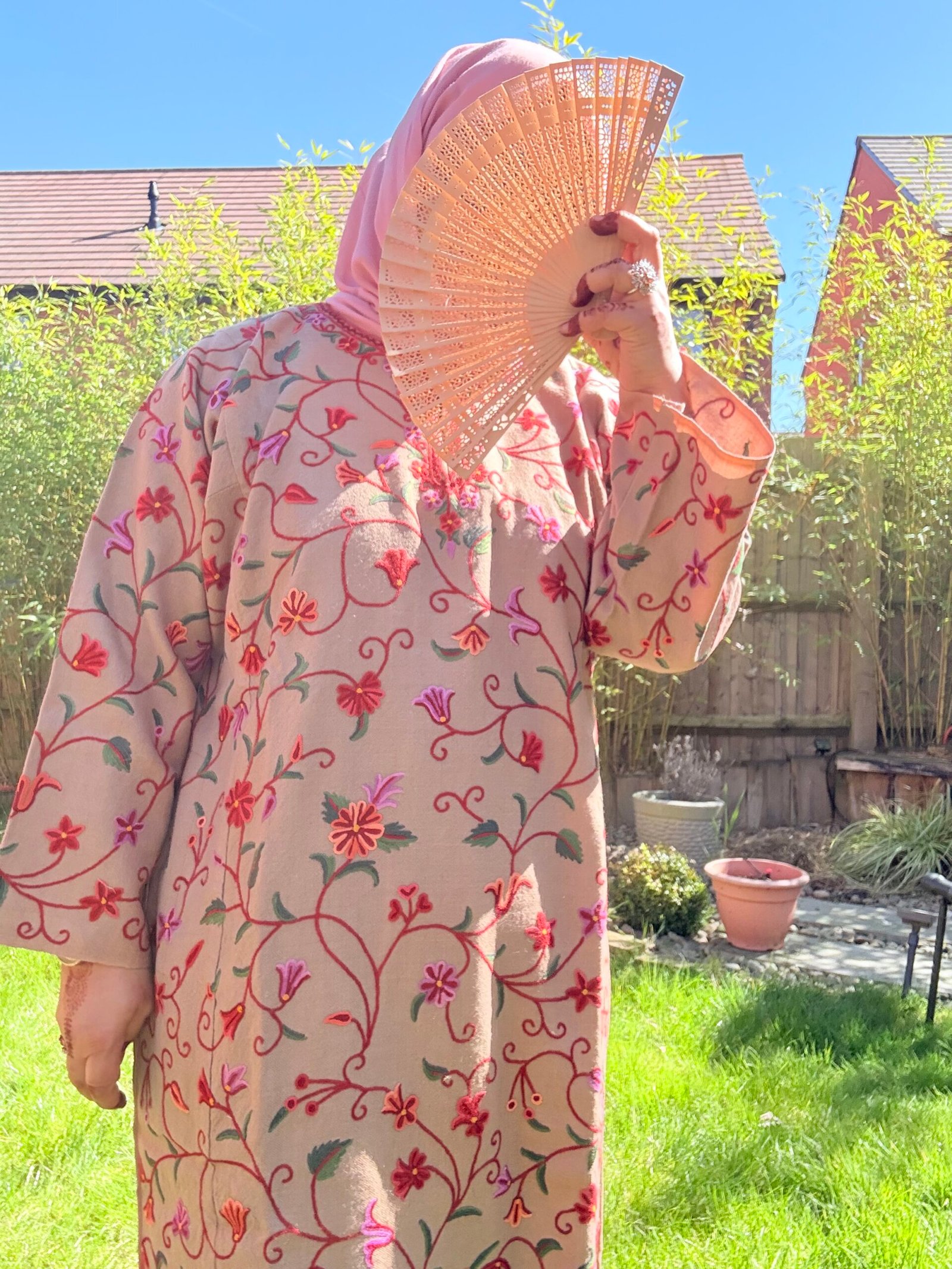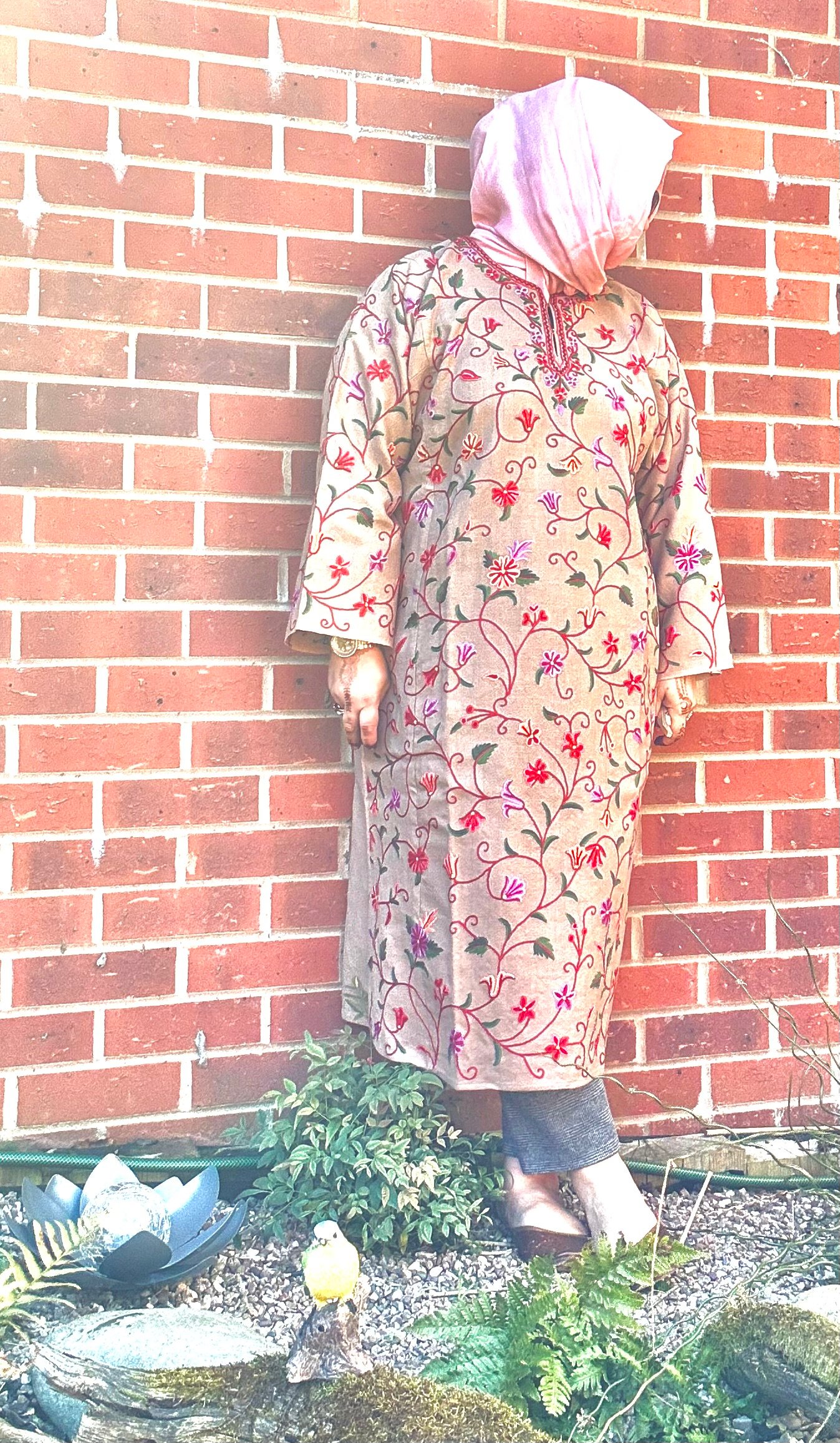 Gul-e-Banafsha captures the essence of a blooming Kashmiri garden in spring. Set on a soft beige wool base, this elegant phiran is embellished with vibrant aari embroidery in rich hues of pink, coral, and crimson. The delicate floral vines climb gracefully along the fabric, evoking warmth, femininity, and timeless tradition.