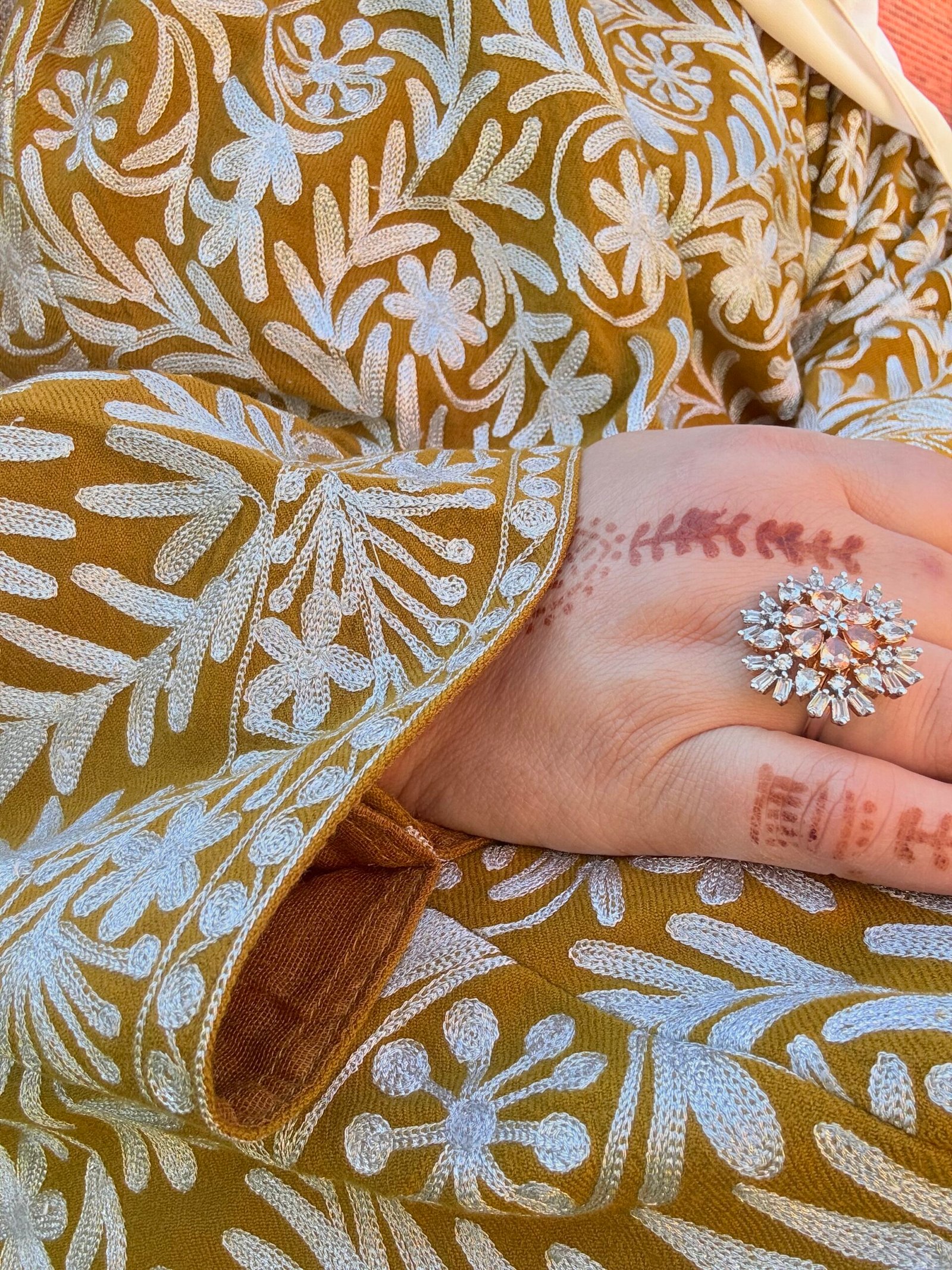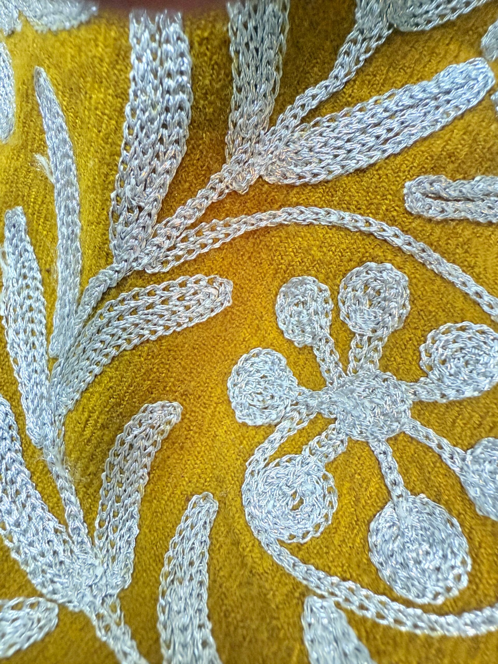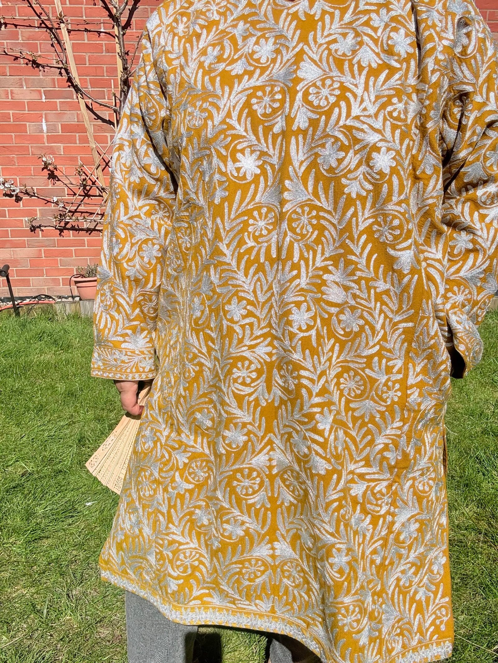 Graceful like the marigold it’s named after, Gul-e-Maryam is a radiant ode to Kashmiri tradition. Crafted from rich mustard-toned wool, this phiran is brought to life with full-body silver Kasheeda embroidery, forming a glistening tapestry of floral motifs and paisleys across its surface. The silken threads shimmer softly against the wool base, making it a perfect piece for winter elegance.