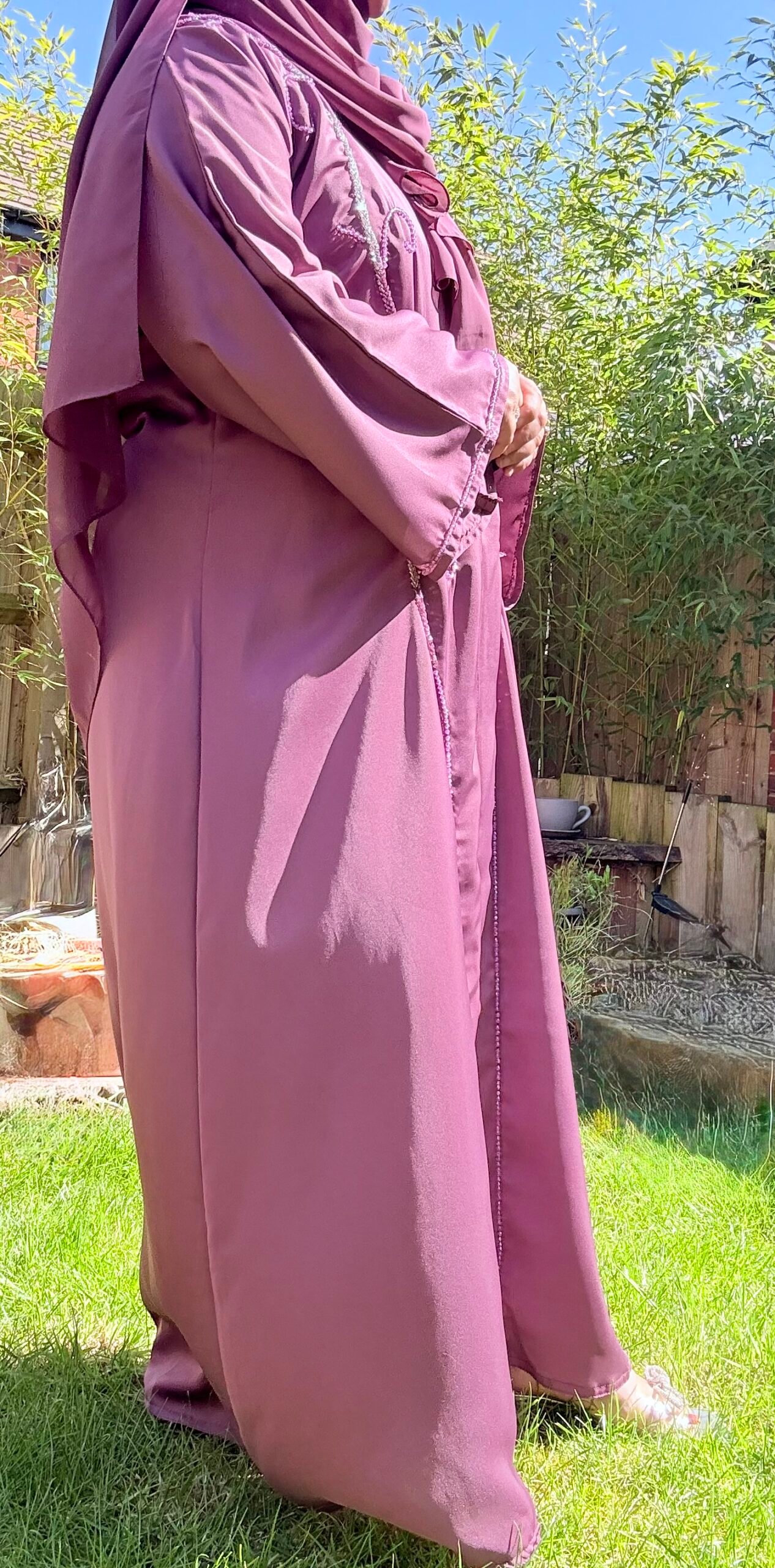 Deep mauve-pink abaya with intricate embroidery and beading
