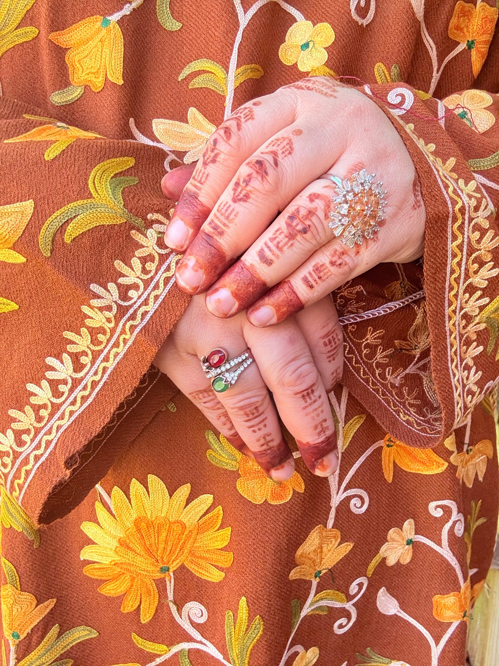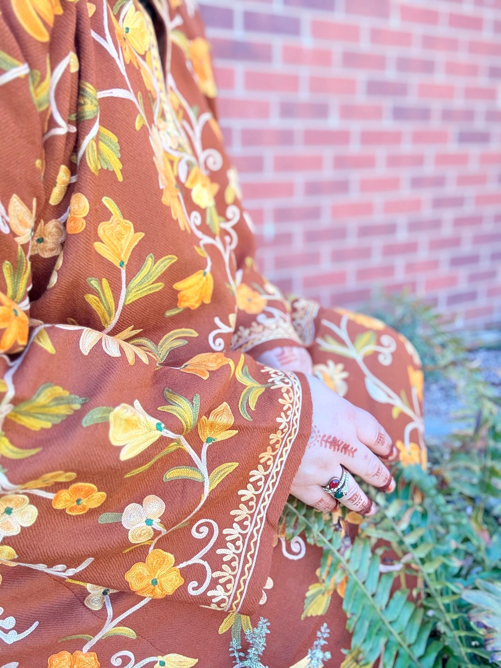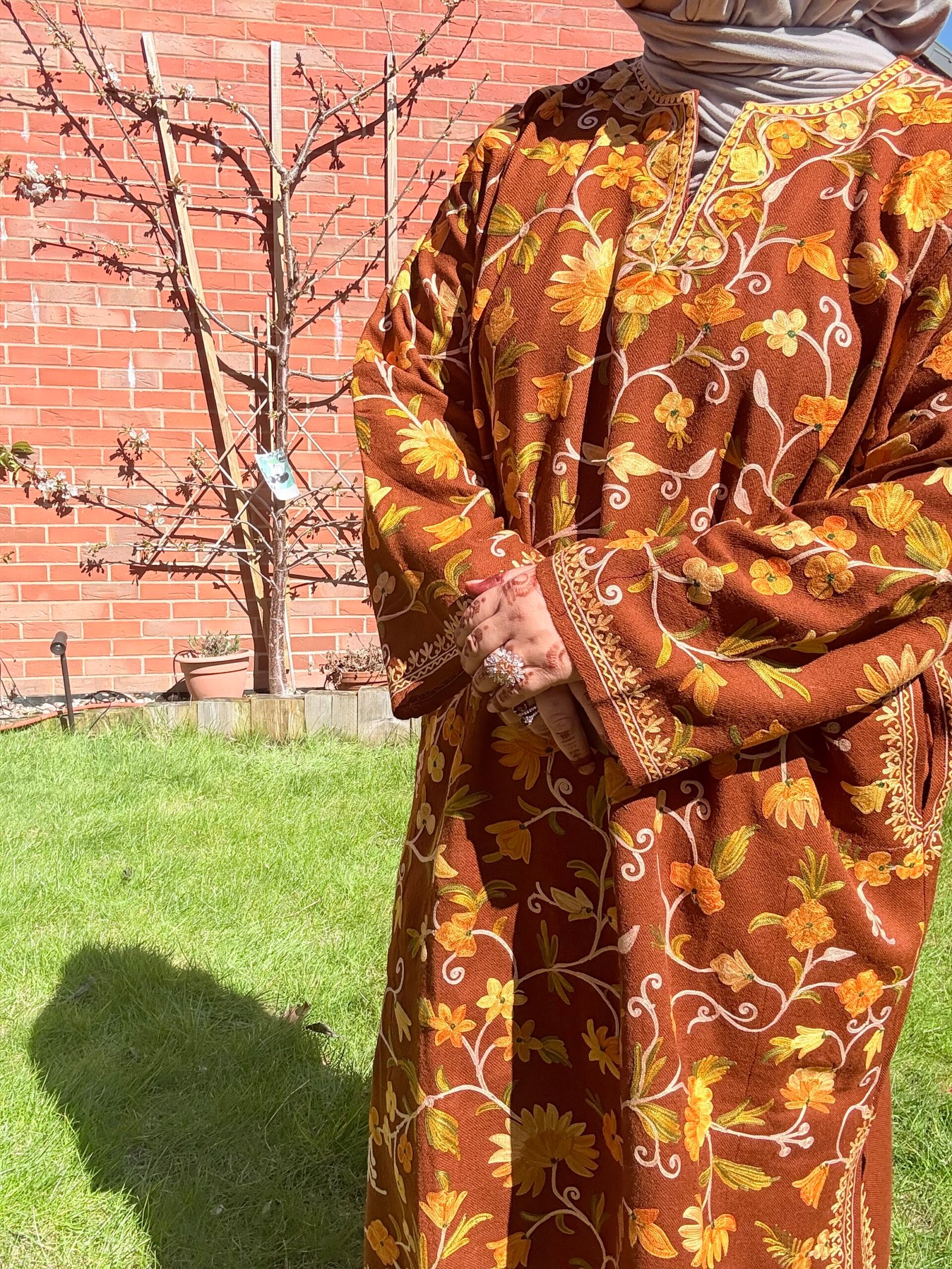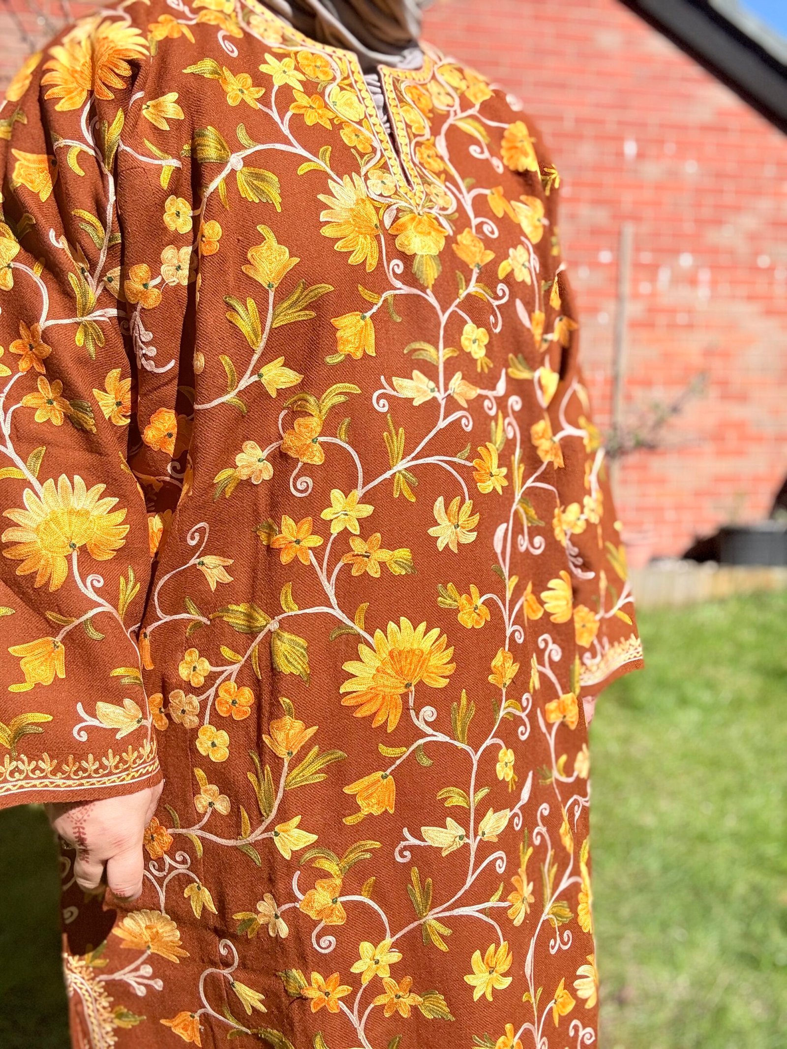 Inspired by the delicate charm of the Nargis flower, this phiran brings a golden glow to winter wardrobes. Set on a rich burnt ochre wool base, Nargis is embroidered with blooming aari florals in shades of sunflower yellow, amber, ivory, and olive green — like sunlight spilling through an autumn garden.