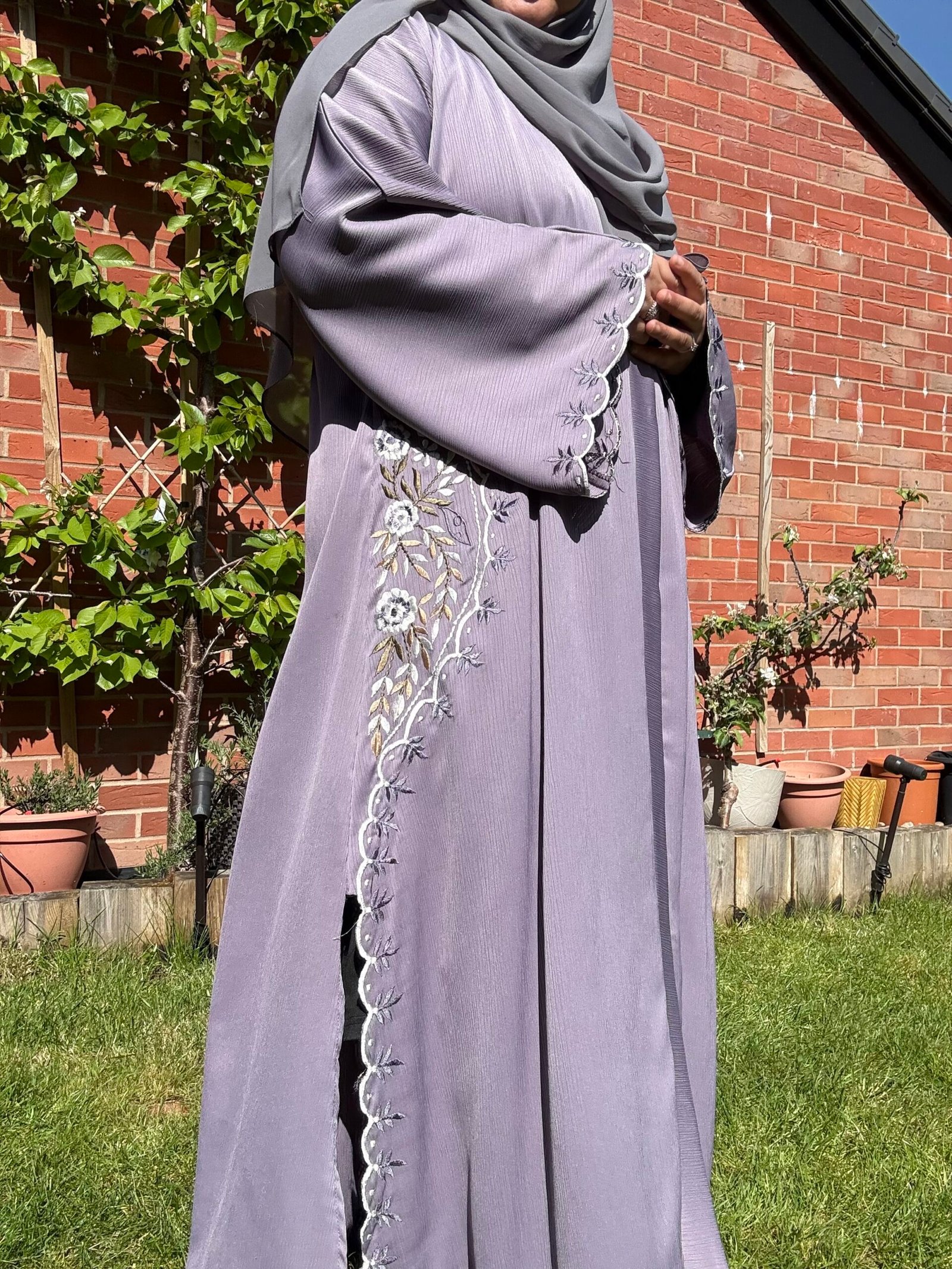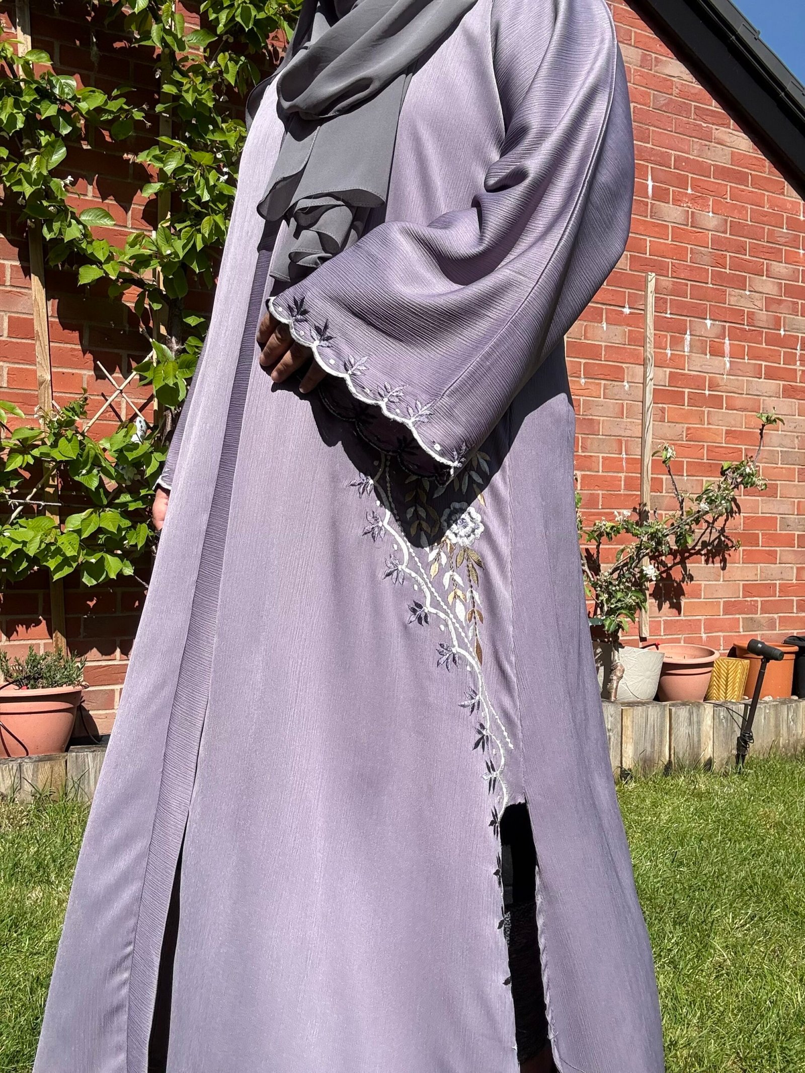 A delicate blend of lilac and grey, Nawaal is where sophistication meets softness. Featuring graceful white and silver floral embroidery that trails from the sleeve to the side slit, this abaya is perfect for serene days and graceful evenings. The scalloped cuffs add a refined finishing touch, while the textured fabric flows effortlessly — a must-have for timeless modest dressing.