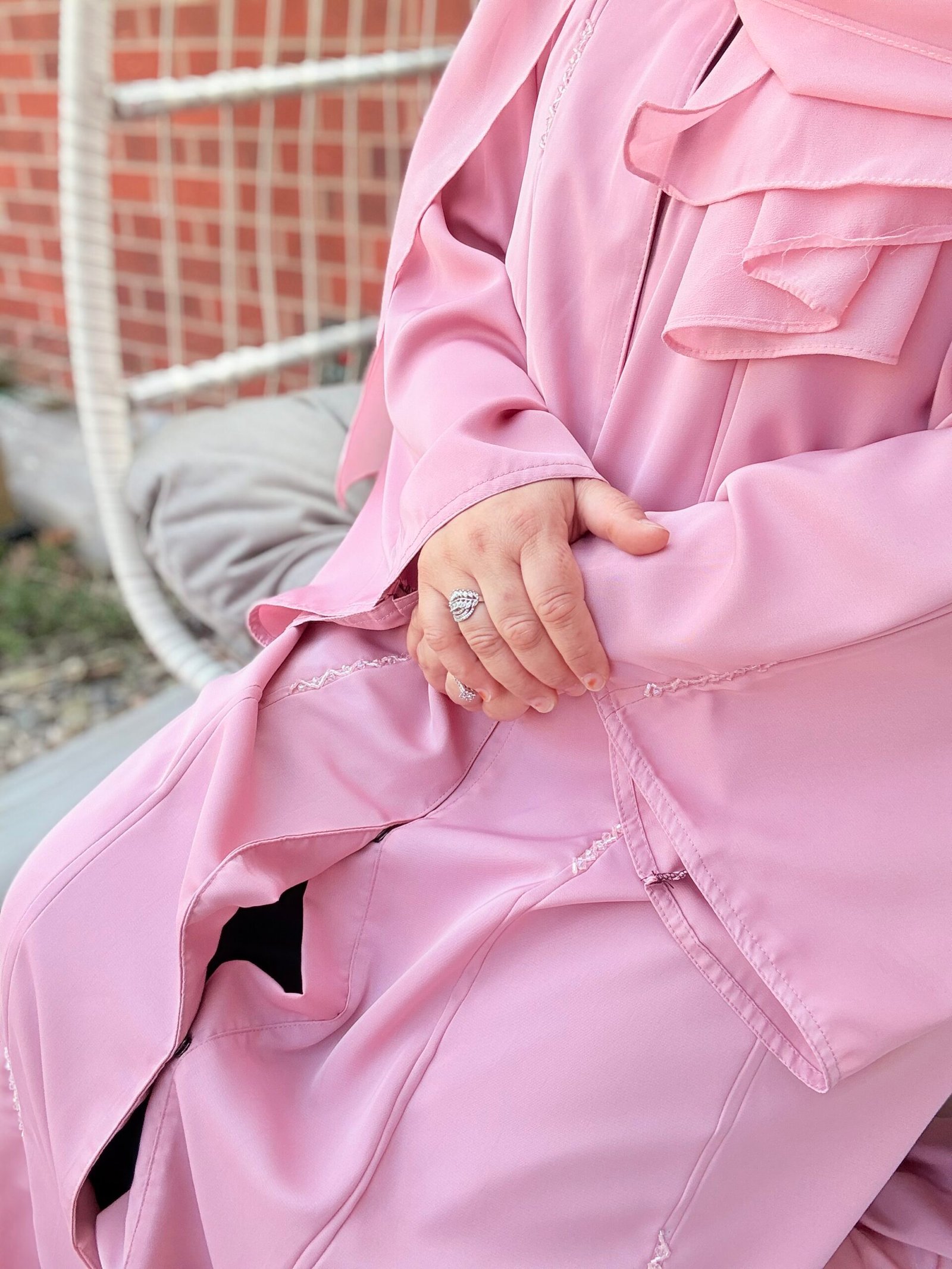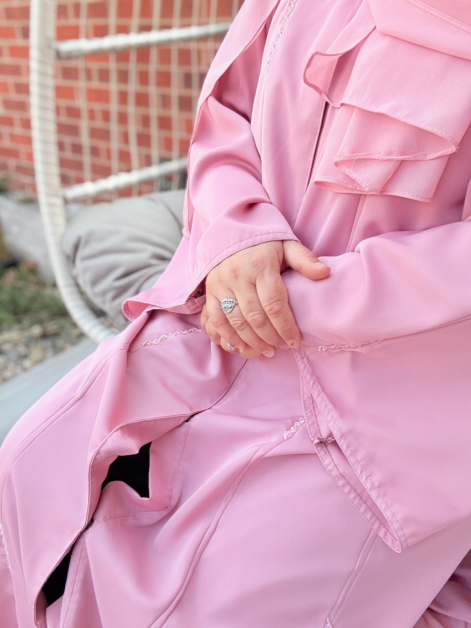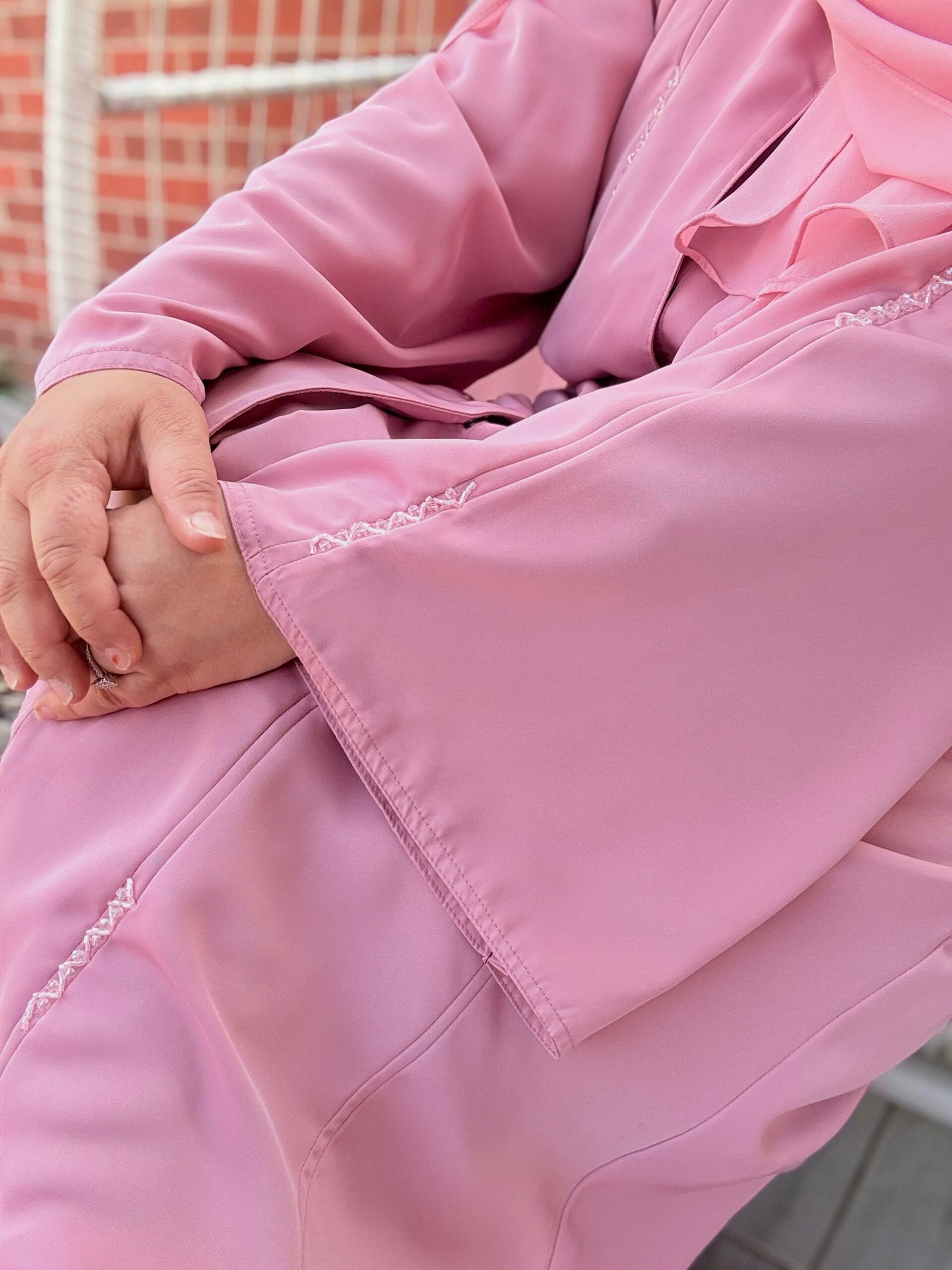 Soft as a dawn breeze, Sahar is a blush-toned abaya that pairs classic simplicity with a delicate touch. Featuring a graceful front pleat and a fabric rosette at the neckline, this piece offers a subtle statement for those who love understated femininity. Whether worn to brunch or for a serene evening walk, Sahar is where modest charm meets timeless design.