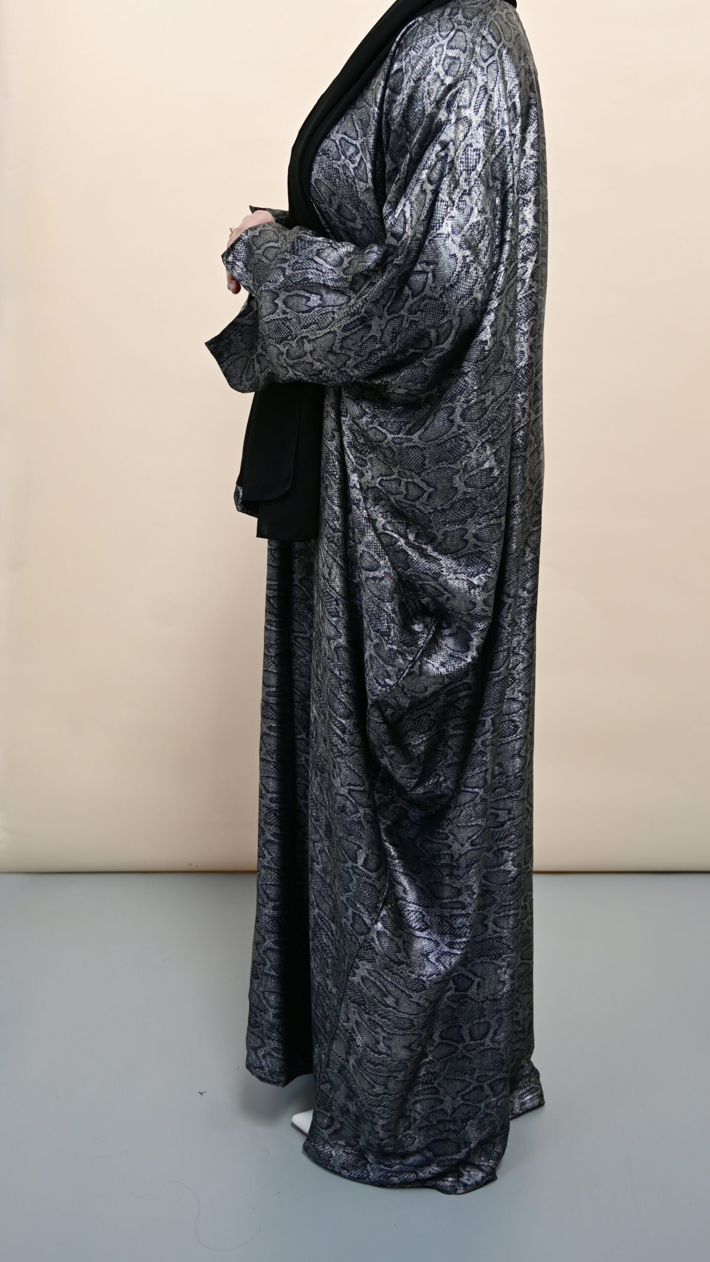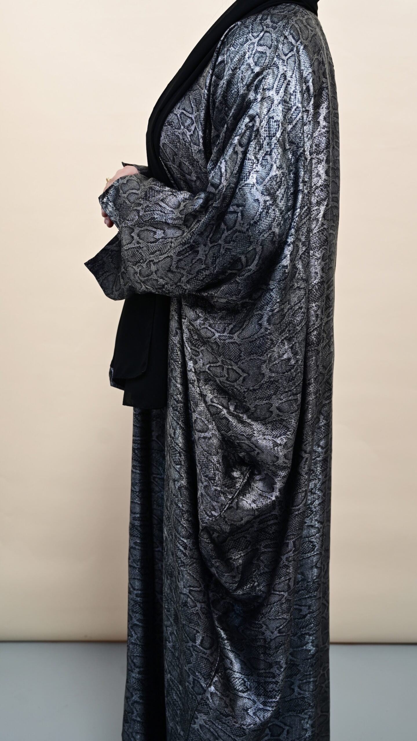 Bold and luminous like a desert moon, Samar is a standout metallic snake-print abaya that blends attitude with elegance. With its rich texture and glistening surface, this piece speaks to the woman who carries confidence with grace. Perfect for glamorous evenings, Eid nights, or formal events where you want to leave a lasting impression.
