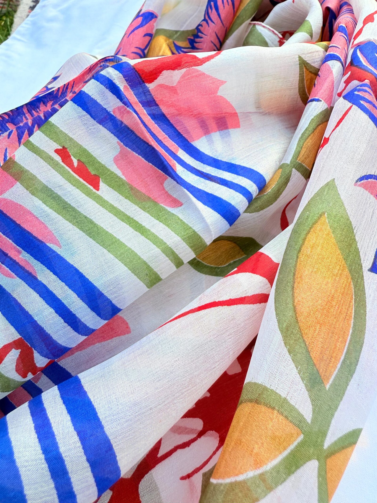 Painterly florals and nautical stripes meet in a pastel symphony of coral, blue, and olive.