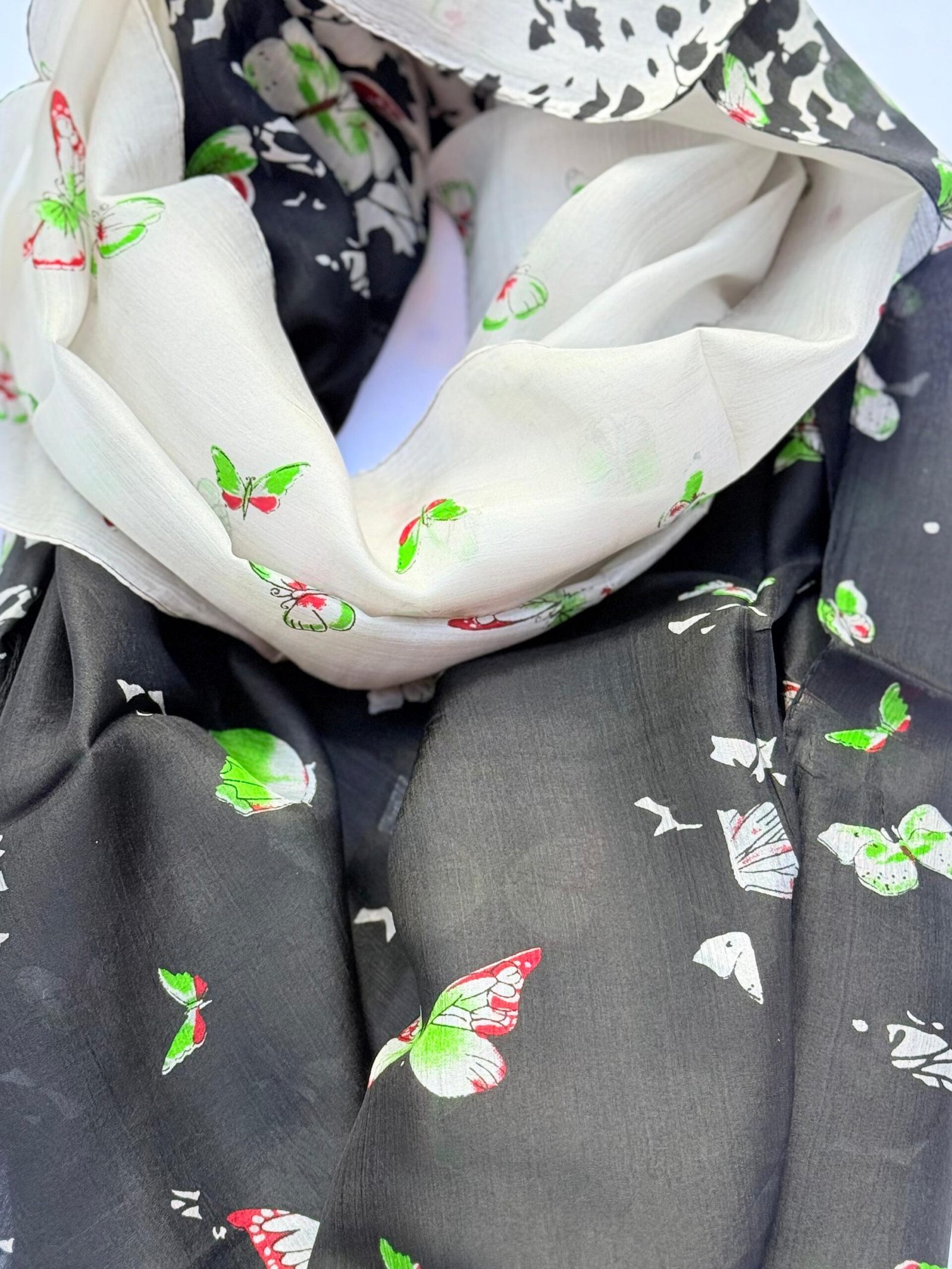 Black-and-white floral silhouettes with bright lime butterflies—a soft rebellion in monochrome.